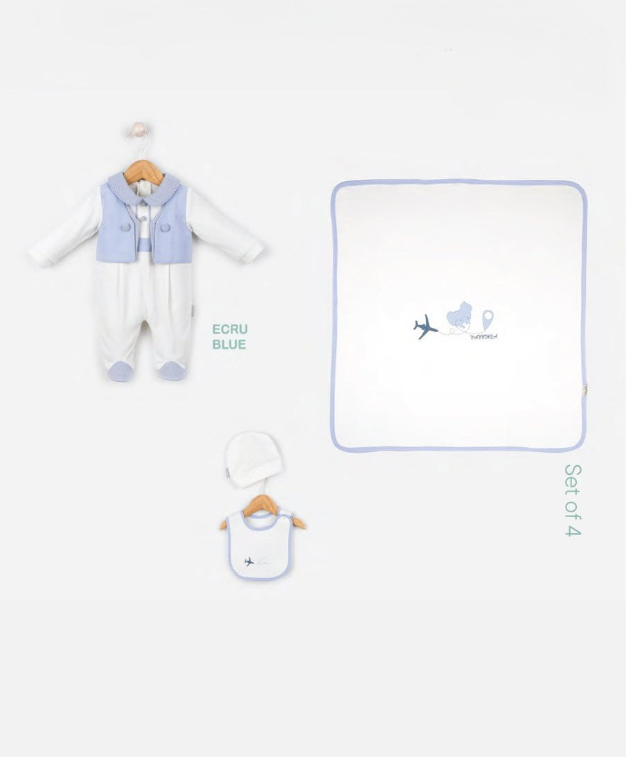 Ensemble naissance 4 pièces : barboteuse, bavoir, bonnet et couverture, 100% coton