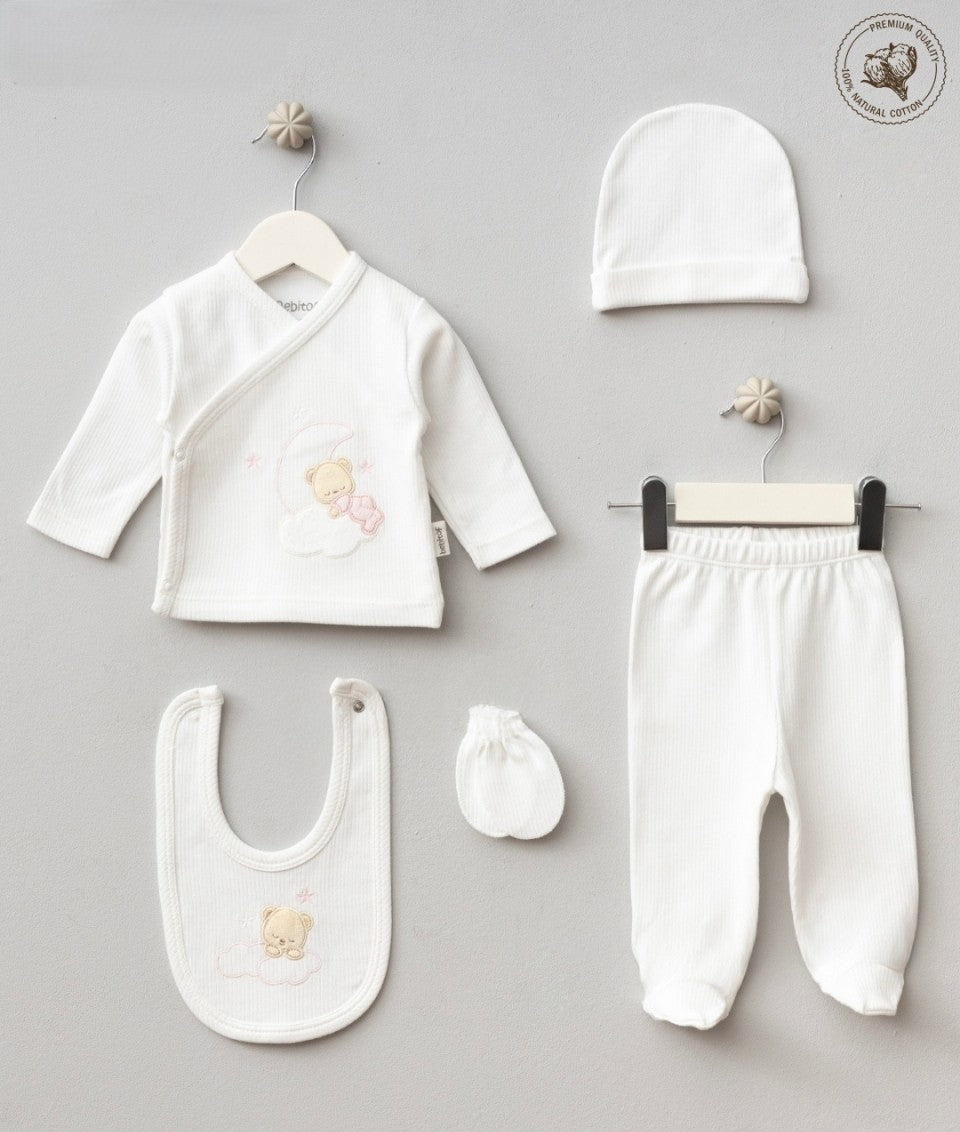Ensemble naissance de 5 pièces : pantalon, haut, bavoir, bonnet et mouffles. Lune en bleu