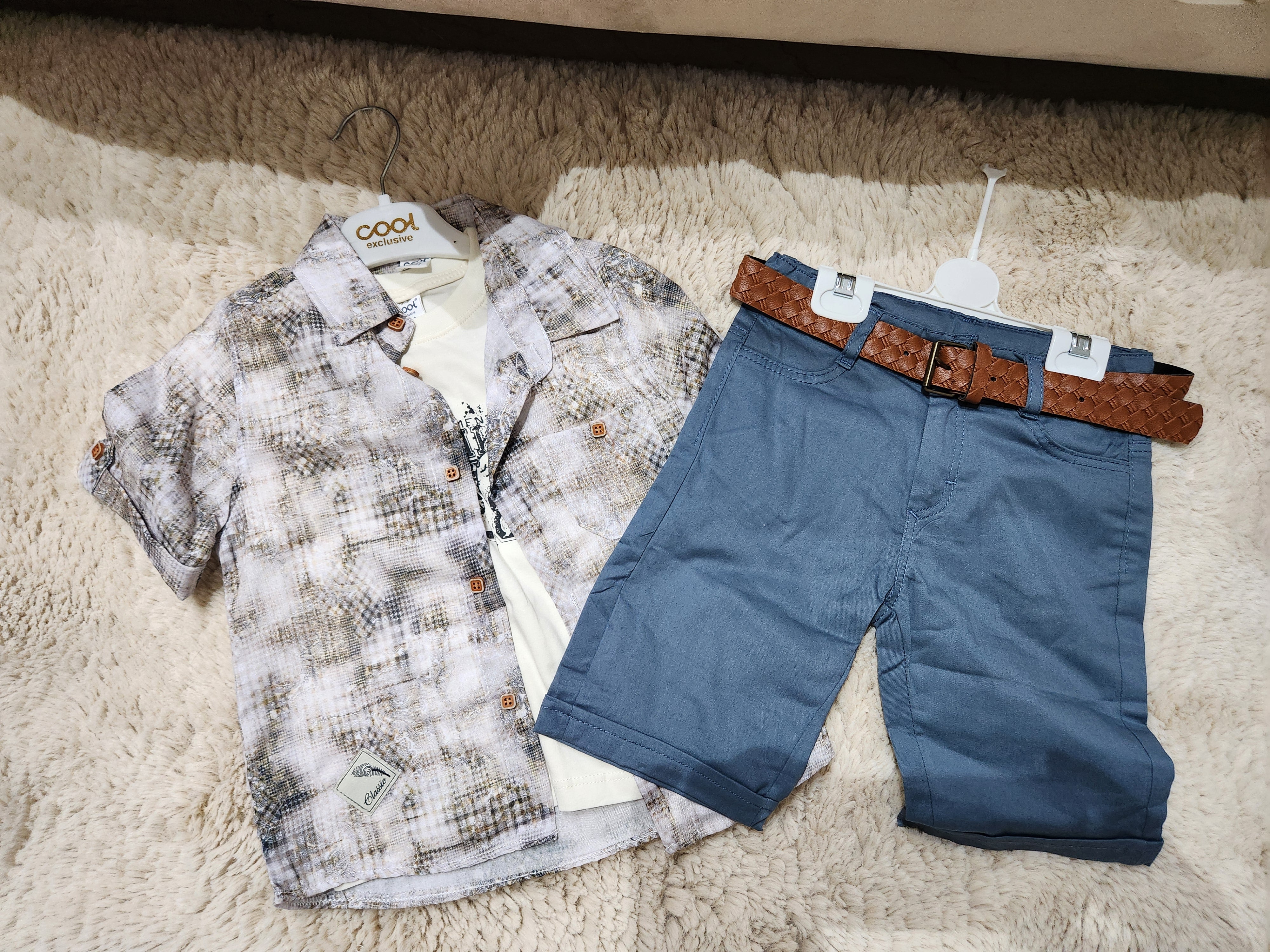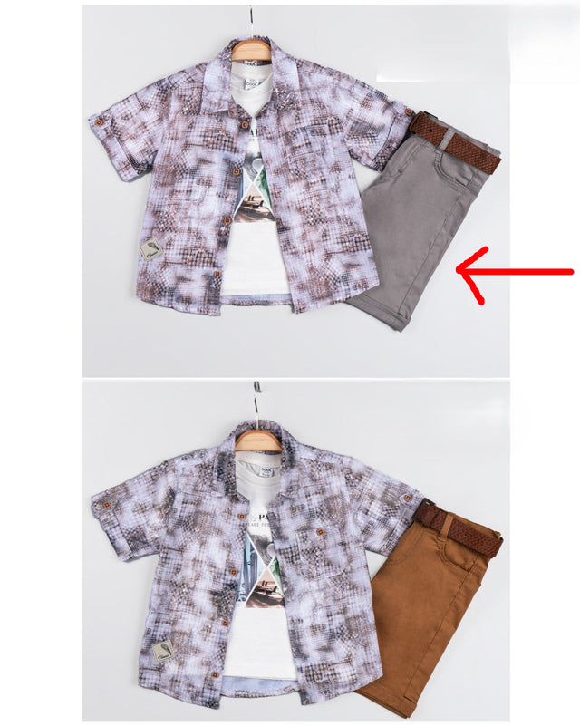Ensemble 3 pièces short, chemise et t-shirt en coton (modèle gris/bleu)