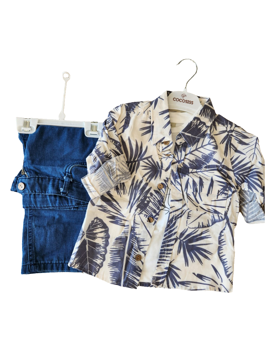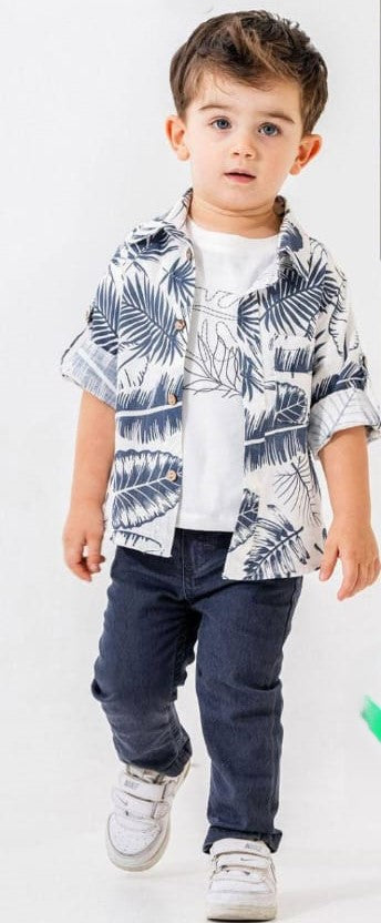 Ensemble 3 pièces jeans, t-shirt manche longue et chemise avec manches retroussables