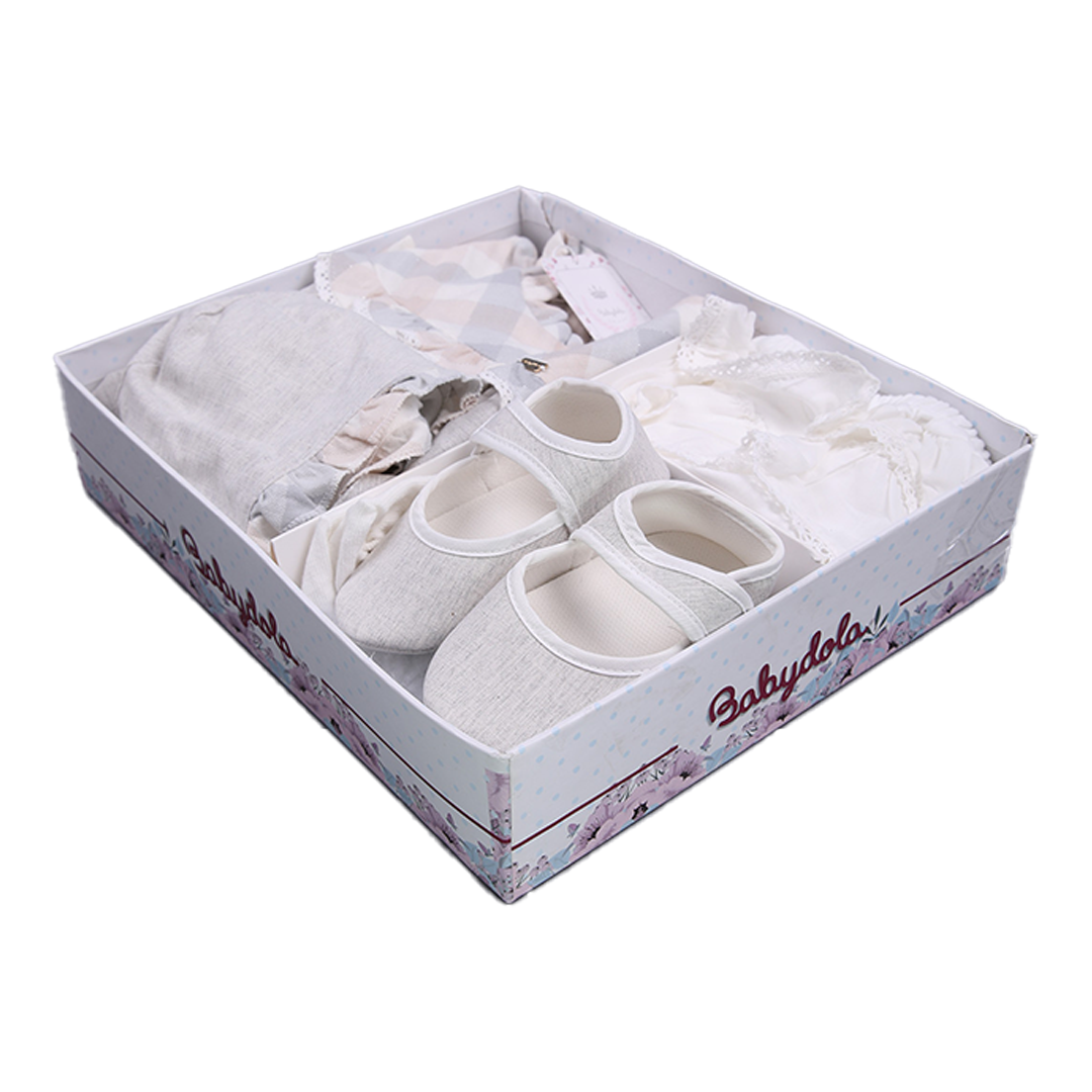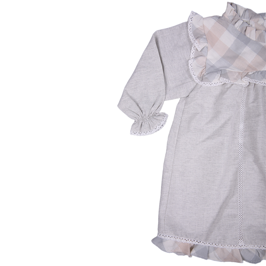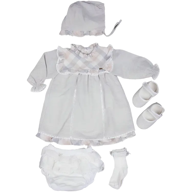 Ensemble 5 pièces : Robe en coton-lin avec bonnet assorti, chaussettes, culotte et chaussons