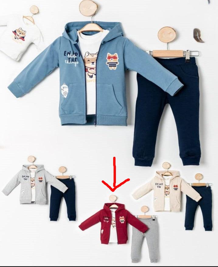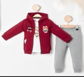 Ensemble 3 pièces : pantalon, t-shirt manche longue et pull en coton (rouge et gris)