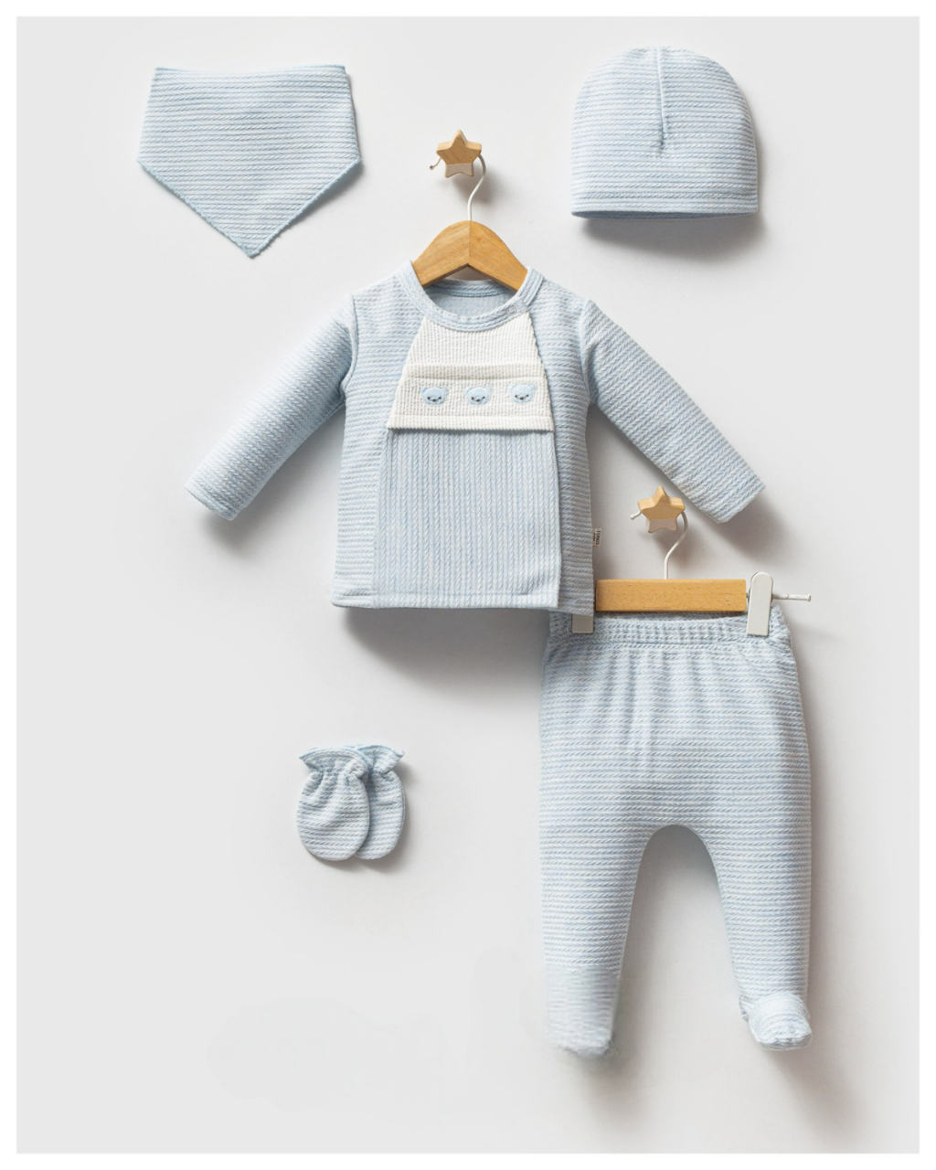 Ensemble de naissance 5 pièces bleu : pantalon, haut, bonnet, mouffles et bavoir