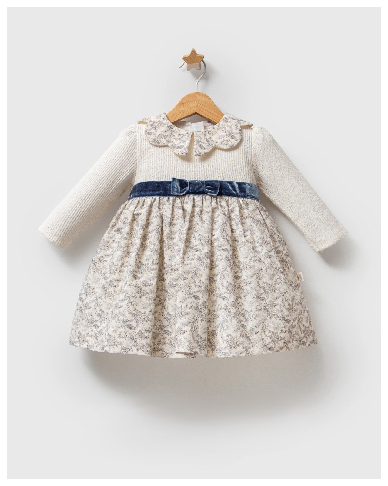 Robe élégante en coton imprimé floral. Haut en maille tricotée découpée avec une ceinture bleu en velours.